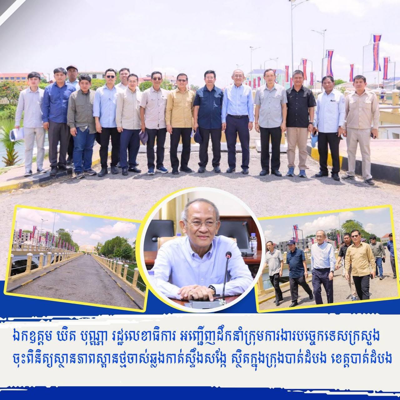 (បាត់ដំបង)៖ លោក យិត បុណ្ណា រដ្ឋលេខាធិការក្រសួងសាធារណការ និងដឹកជញ្ជូន នាថ្ងៃទី២៤ ខែមេសា ឆ្នាំ២០២៥នេះ បានដឹកនាំក្រុមការងារបច្ចេកទេសក្រសួង ចុះពិនិត្យស្ថានភាពស្ពានថ្មចាស់ ឆ្លងកាត់ស្ទឹងសង្កែ តភ្ជាប់ពីផ្លូវក្រុងលេខ១ ទៅវិថីសម្ដេចក្រឡាហោម ដែលមានទីតាំងស្ថិតនៅខាងមុខអគារចាស់សាលាខេត្ត ក្នុងភូមិកម្មករ សង្កាត់ស្វាយប៉ោ ក្រុងបាត់ដំបង ខេត្តបាត់ដំបង។
