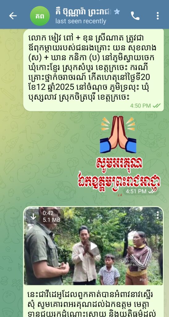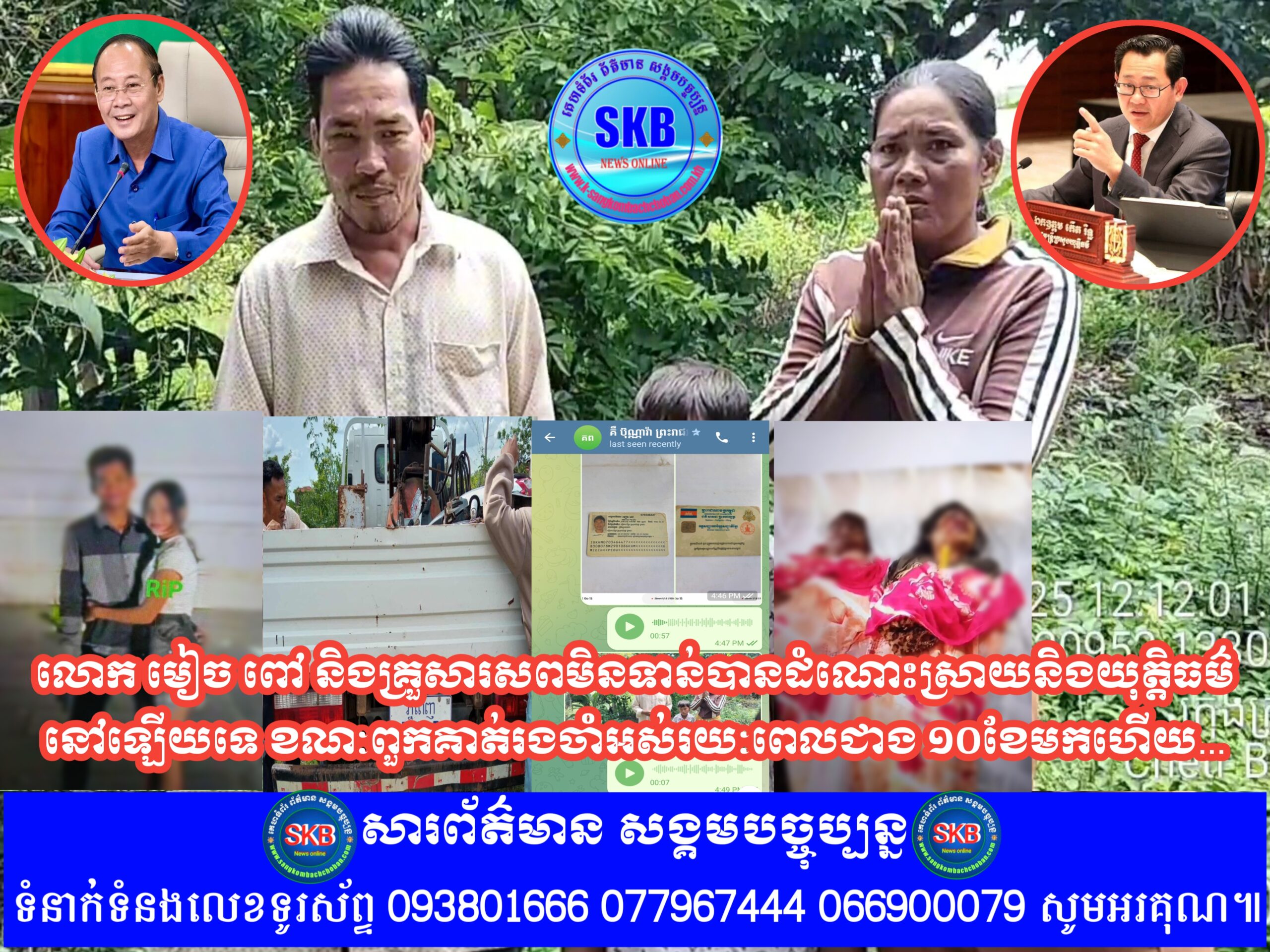 ខេត្តក្រចេះ ÷ ប្រិយមិត្តជាទីរាប់អាន លោក មៀច ពៅ និងអ្នកស្រី ខុន ស្រីណាត រស់នៅភូមិស្វាយចេក ឃុំកោះខ្ញែរ ស្រុកសំបូរ ខេត្តក្រចេះ ត្រូវជាឪពុកម្តាយសព្វជនរងគ្រោះបានលើកឡើងថា អស់រយៈពេលជាង១០ខែទៅហើយ ដែលពួកគាត់នៅពុំទាន់ទទួលបានការដោះស្រាយនិងយុត្តិធម៌នៅឡើយទេ ខណៈកូនប្រុសស្រីរបស់គាត់ត្រូវបានស្លាប់បាត់បង់ជីវិត កាលពីចុងឆ្នាំ២០២៤កន្លងទៅ។គួររំលឹកផងដែរថាកាលពីថ្ងៃទី២០ ខែវិច្ឆិកា ឆ្នាំ២០២៤ មានករណីគ្រោះថ្នាក់ចរាចរណ៍មួយបង្កឡើងដោយរថយន្តកូរ៉េដឹកទំនិញ ០១គ្រឿងម៉ាក JAC ពណ៌ស ពាក់ស្លាកលេខ ភ្នំពេញ 3F-9358 បានបុកម៉ូតូ ០១គ្រឿងម៉ាកវ៉េវ ពណ៌ស ជិះពីរនាក់ប្តីប្រពន្ធ ចំពីមុខនៅចំណុចភូមិទ្រលុះ ឃុំបុស្សលាវ ស្រុកចិត្របុរី ខេត្តក្រចេះ បណ្ដាលអោយអ្នកជិះម៉ូតូស្លាប់ភ្លាមៗនៅកន្លែងកើតហេតុ រីឯអ្នកបើកបររថយន្តបានរត់គេចខ្លួនបាត់ដោយសុវត្ថិភាព ។រាល់វត្ថុតាងត្រូវបានកម្លាំងប៉ុស្តិ៍រដ្ឋបាលបុស្សលាវនិងអធិការបានធ្វើការវាស់វែង និងប្រមូលយកទៅរក្សារទុកនៅអធិការដ្ឋាននគរបាលស្រុកចិត្របុរី ចំណែកសព្វត្រូវបានឪពុកម្តាយយកទៅធ្វើបុណ្យ នៅឯភូមិស្វាយចេក ឃុំកោះខ្ញែរ ស្រុកសំបូរ តាមប្រពៃណី។ គួរបញ្ជាក់ផងដែរថាសពជនរងគ្រោះមានឈ្មោះ ឃាន កន្និកា ភេទប្រុស អាយុ ២១ឆ្នាំ ត្រូវជាកូនប្រសារ និងឈ្មោះ យន ស្រីលាភ ភេទស្រី អាយុ ១៥ឆ្នាំ ត្រូវជាកូនបង្កើត រស់នៅភូមិស្វាយចេក ឃុំកោះខ្ញែរ ស្រុកសំបូរ ខេត្តក្រចេះ។បន្ទាប់ពីបានធ្វើបុណ្យរួចរាល់ លោក មៀច ពៅ និងអ្នកស្រី ខុន ស្រីណាត បានដាក់ពាក្យបណ្តឹងទៅអធិការដ្ឋាននគរបាលស្រុកចិត្របុរី ដើម្បីទាមទាររកយុត្តិធម៌និងដំណោះស្រាយជូនពួកគាត់ ប៉ុន្តែរហូតមកទល់ថ្ងៃទី២៨ ខែតុលា ឆ្នាំ២០២៥ បច្ចុប្បន្ននេះ ពុកគាត់នៅពុំទាន់បានពន្លឺយុត្តិធម៌នៅឡើយទេ។យោងតាមប្រសាសន៍ដ៏ថ្លៃថ្លារបស់ឯកឧត្តម កើត រិទ្ធ រដ្ឋមន្ត្រីក្រសួងយុត្តិធម៌ បានលើកឡើងថា រាល់ស្ថាប័នតុលាការគ្រប់រាជធានី-ខេត្ត ត្រូវពន្លឿនដំណោះស្រាយរឿងក្តីជួនប្រជាពលរដ្ឋ ឲ្យបានឆាប់រហ័ស តាមអ្វីដែលអាចធ្វើទៅបាន មិនត្រូវផ្អិបរឺអូសបន្លាយរឿងក្តីទុកនោះទេ នៅពេលគ្រោះថ្នាក់ចរាចរណ៍ ជនរងគ្រោះ គ្រួសារជនរងគ្រោះ មានបញ្ហាបាត់បង់ទៅហើយ ប៉ុន្តែបើគាត់រងគ្រោះក្នុងគ្រោះថ្នាក់ចរាចរណ៍ហើយ កុំឱ្យគាត់រងគ្រោះនៅក្នុងនីតិវិធីទៀត។ទោះបីជាយ៉ាងនេះក្តីគ្រួសារសពជនរងគ្រោះ ទទូចស្នើសុំដល់ថ្នាក់ដឹកនាំគ្រប់លំដាប់ថ្នាក់ ឯកឧត្តម គឺ ប៊ុណ្ណារ៉ា ព្រះរាជអាជ្ញាអយ្យការអមសាលាដំបូងខេត្តក្រចេះ ឯកឧត្តម វ៉ា ថន អភិបាលខេត្តក្រចេះ មេត្តាជួយពន្លឿន សុំណុំរឿងខាងលើនេះផងទាន ពិសេសគោរពស្នើសុំដល់ឯកឧត្តម កើត រិទ្ធ រដ្ឋមន្ត្រីក្រសួងយុត្តិធម៌ មេត្តាទានចាត់កម្ល