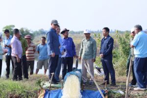 ឯកឧត្តមអភិបាលខេត្ត បន្តថា៖ សម្រាប់ស្រូវរបស់បងប្អូនប្រជាពលរដ្ឋដែលកំពុងប្រឈមបញ្ហាខ្វះខាតទឹកនេះនេះ អាជ្ញាធរ និងមន្ត្រីជំនាញ បានគិតគូរ និងខិតខំស្វែងរកទឹក ដើម្បីធ្វើការស្រោចស្រពជូនបងប្អូនឱ្យផលស្រូវទទួលបានទិន្នផលដោយមិនរងនូវការខ្វះខាតទឹកស្រោចស្រពឡើយ ព្រោះថាតំបន់នេះគឺជាតំបន់ដែលមិនមានអាងស្តុកទឹកឡើយ ដោយតំបន់នេះពឹងផ្អែកទៅលើប្រឡាយស្តុកទឹក ហើយនៅពេលដែលប្រឡាយអស់ទឹកនោះស្រូវរបស់បងប្អូនប្រជាពលរដ្ឋនឹងជួបបញ្ហាប្រឈម ប៉ុន្តែអាជ្ញាធរបានធ្វើការគិតគូរដោយធ្វើការបូមទឹកពីតាមព្រែក និងទន្លេដែលនៅជិតតំបន់នេះ បញ្ចូលក្នុងប្រឡាយដើម្បីឱ្យបងប្អូនប្រជាកសិករមានទឹកសម្រាប់ស្រោចស្រពស្រូវ។