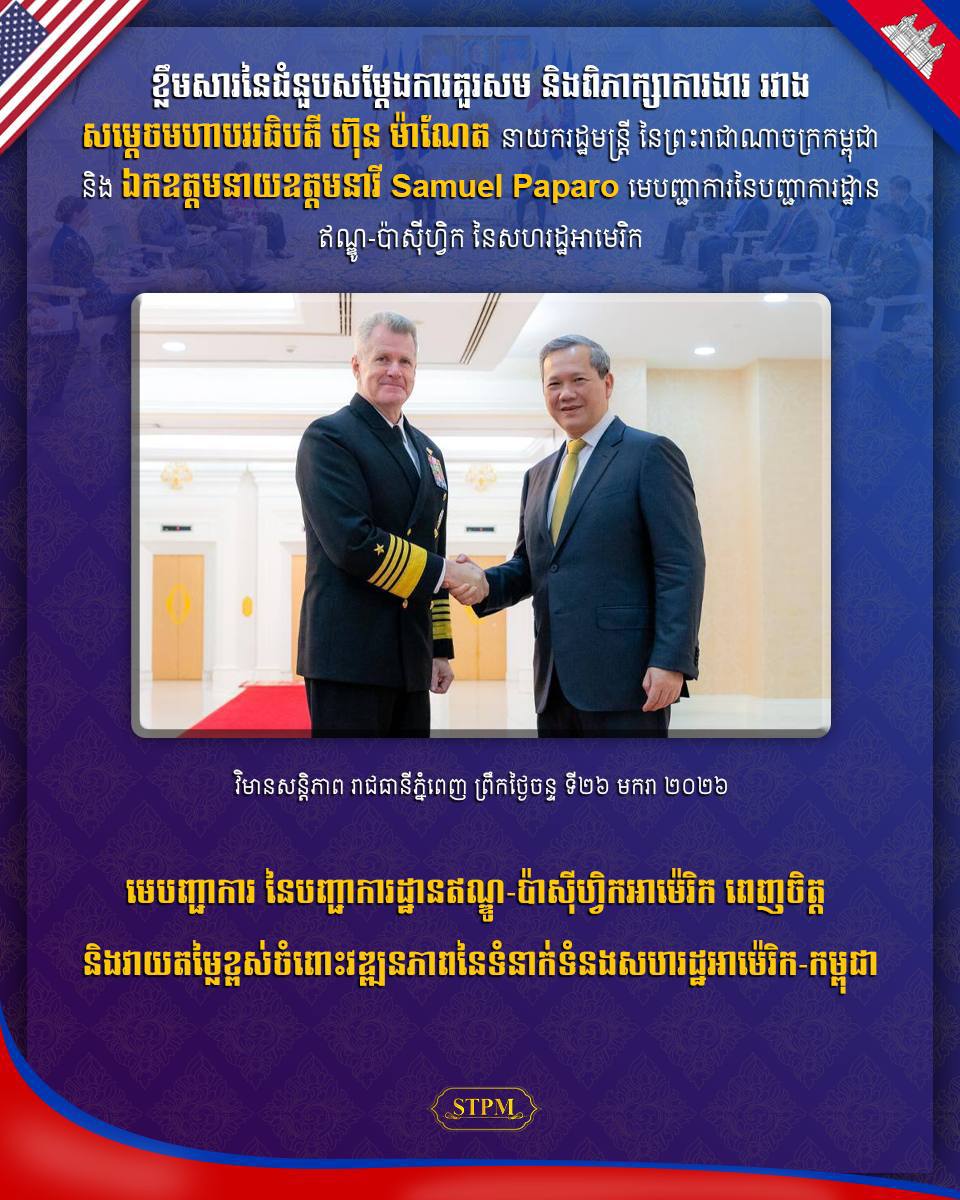 នាព្រឹកថ្ងៃទី២៦ ខែមករា ឆ្នាំ២០២៦ សម្តេចមហាបវរធិបតី ហ៊ុន ម៉ាណែត នាយករដ្ឋមន្ត្រីនៃព្រះរាជាណាចក្រកម្ពុជា បានអនុញ្ញាតឱ្យ ឯកឧត្តម នាយឧត្តមនាវី Samuel Paparo មេបញ្ជាការនៃបញ្ជាការដ្ឋានឥណ្ឌូ-ប៉ាស៊ីហ្វិក នៃសហរដ្ឋអាម៉េរិក ចូលជួបសម្តែងការគួរសម និងពិភាក្សាការងារ នៅវិមានសន្តិភាព។