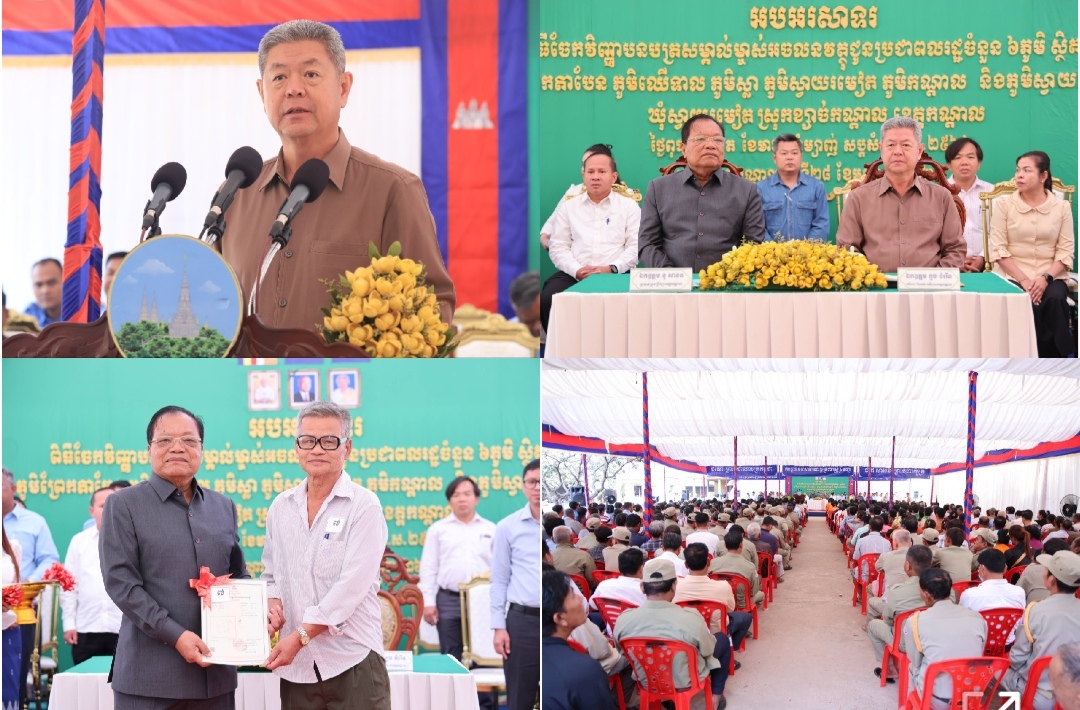 ខេត្តកណ្តាល៖ ឯកឧត្តម នូ សាខន ប្រធានក្រុមប្រឹក្សាខេត្តកណ្ដាល និងឯកឧត្តម គួច ចំរើន អភិបាល នៃគណៈអភិបាលខេត្តកណ្ដាល នាព្រឹកថ្ងៃទី២៨ ខែមករា ឆ្នាំ២០២៦នេះ បានអញ្ជេីញជាអធិបតីក្នុងពិធីចែកវិញ្ញាបនបត្រសម្គាល់ម្ចាស់អចលនវត្ថុ ស្ថិតនៅភូមិព្រែកតាបែន ភូមិឈើទាល ភូមិស្លា ភូមិស្វាយរមៀត ភូមិកណ្តាល ភូមិ ស្វាយដំណាក់ ឃុំស្វាយរមៀត ស្រុកខ្សាច់កណ្តាល ខេត្តកណ្តាល ស្មើនឹង៤,២៩១ប័ណ្ណ។