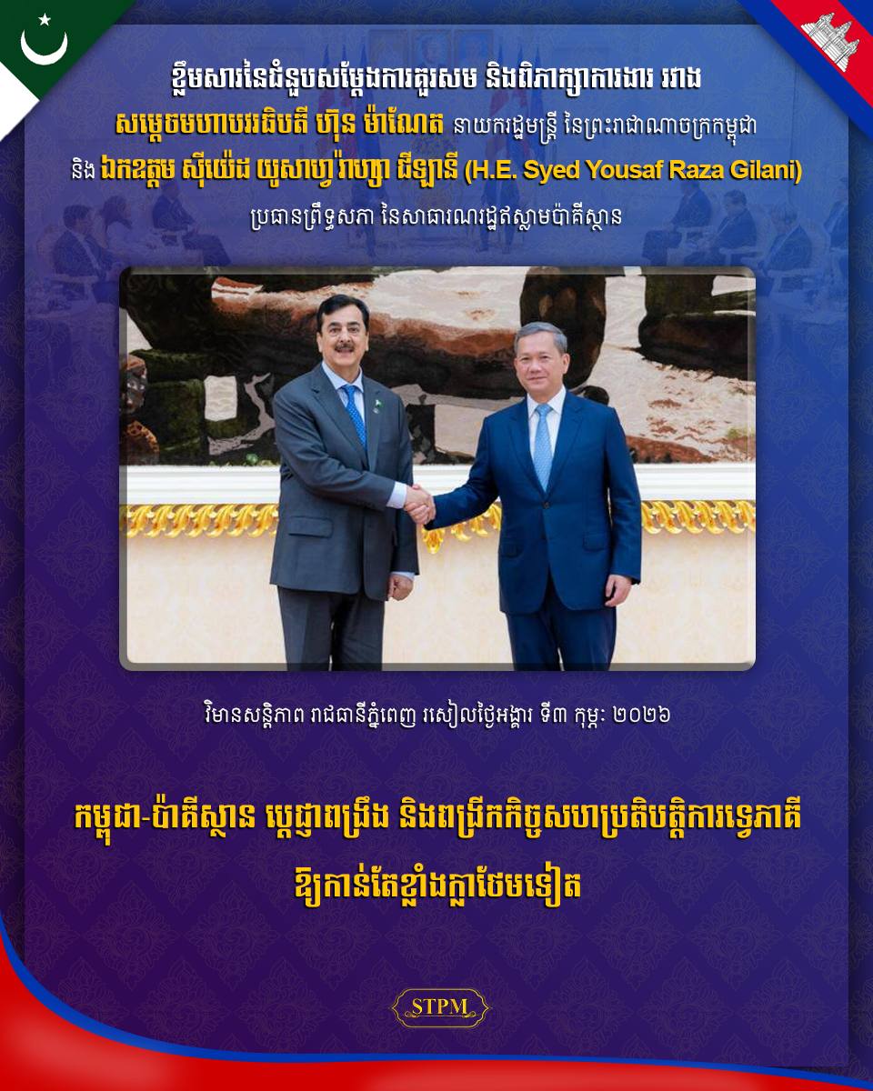 នារសៀលថ្ងៃទី០៣ ខែកុម្ភៈ ឆ្នាំ២០២៦, សម្តេចមហាបវរធិបតី ហ៊ុន ម៉ាណែត នាយករដ្ឋមន្រ្តី នៃព្រះរាជាណាចក្រកម្ពុជា បានទទួលជួបពិភាក្សាការងារជាមួយ ឯកឧត្តម ស៊ីយ៉េដ យូសាហ្វ រ៉ាហ្សា ជីឡានី (H.E. Syed Yousaf Raza Gilani) ប្រធានព្រឹទ្ធសភា នៃសាធារណរដ្ឋឥស្លាមប៉ាគីស្ថាន នៅវិមានសន្តិភាព ក្នុងឱកាសដែលឯកឧត្តមដឹកនាំគណៈប្រតិភូ អញ្ជើញបំពេញទស្សនកិច្ចផ្លូវការ នៅព្រះរាជាណាចក្រកម្ពុជា ពីថ្ងៃទី២ ដល់ថ្ងៃទី៥ ខែកុម្ភៈ ឆ្នាំ២០២៦ ។