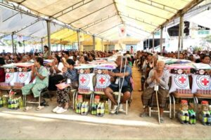 ៣.០០០គ្រួសារ ដែលកំពុងស្នាក់នៅតាមមណ្ឌលសុវត្ថិភាព ក្នុងស្រុកអូរជ្រៅ និងស្រុកថ្មពួក ខេត្តបន្ទាយមានជ័យ។ពិធីសំណេះសំណាលសួរសុខទុក្ខ និងចែកអំណោយមនុស្សធម៌នេះ ក៏មានវត្តមានចូលរួមពីសំណាក់ឯកឧត្តមកិត្តិសង្គហបណ្ឌិត គន់ គីម ទេសរដ្ឋមន្ត្រីទទួលបន្ទុកបេសកកម្មពិសេស និងជាអនុប្រធានទី១ គណៈកម្មាធិការជាតិគ្រប់គ្រងគ្រោះមហន្តរាយ អញ្ជើញចូលរួមផងដែរ។